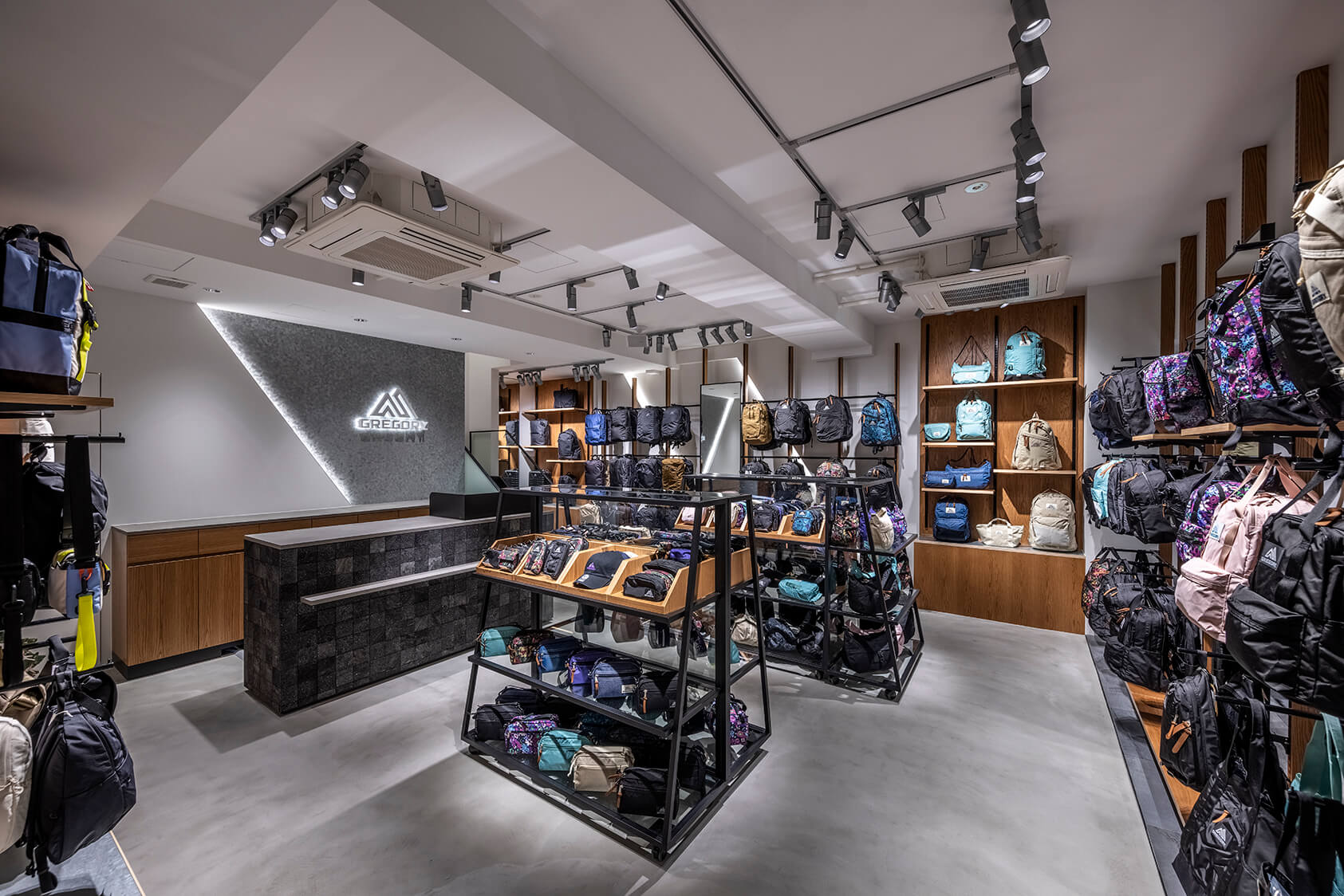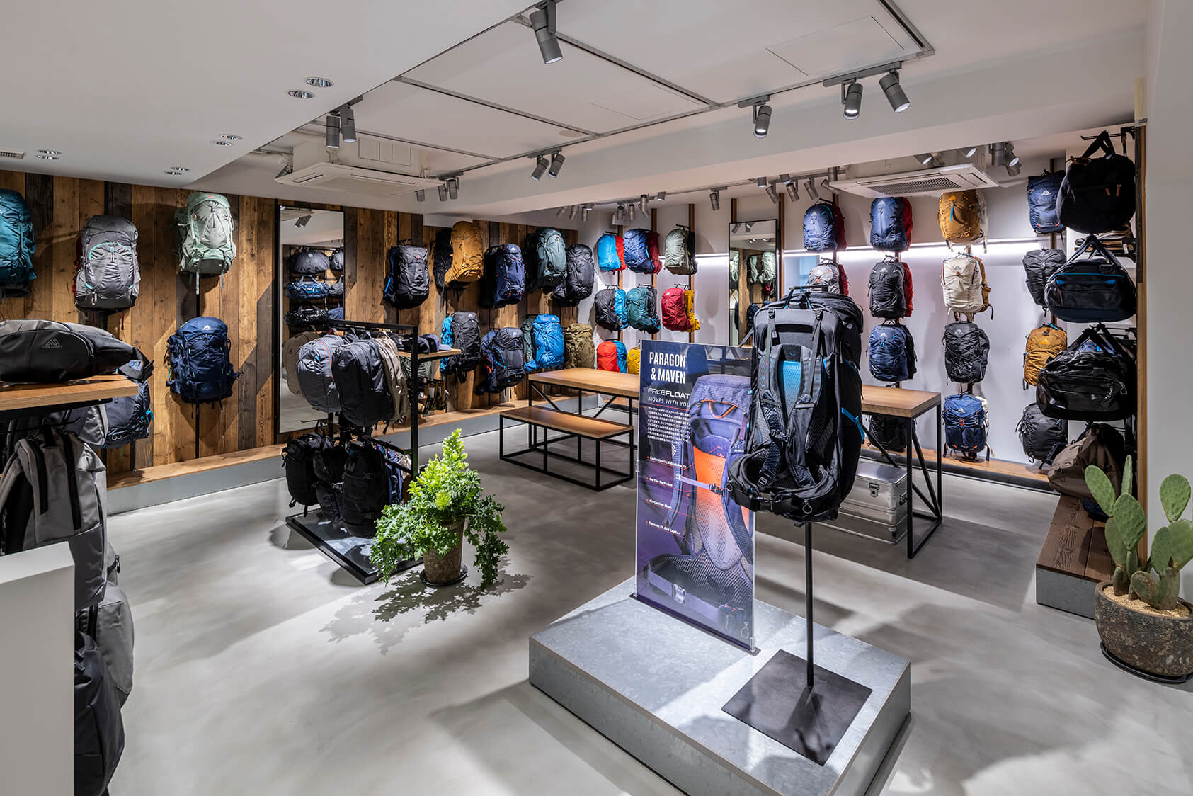 グレゴリー原宿は 1 階と 2 階のフロアに分かれ、1 階ではタウンユースで活躍するバックパックからトートバッグ、ショルダーバッグなどを展開。幅広いラインアップの中から用途に応じて選択できます。2 階ではグレゴリーの DNA である登山バックパックを中心としたアウトドアシーンで活躍するアイテムをご覧いただけます。パック選びにおいて、フィッティングは重要な要素です。グレゴリー原宿では、経験豊富なスタッフがフィッティングや最適なパック選びをサポートいたします。