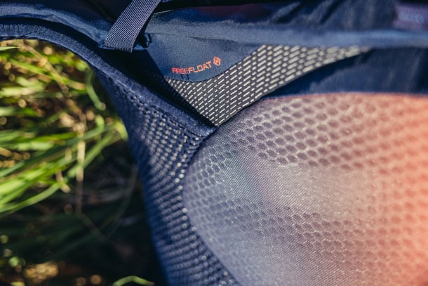 Dフレキシブルなヒップベルトであるフリー・フロートによってヒップベルトは周囲のフレームから独立してパックのサポートシステムと周囲のフレームから独立して動くことで、トレイルを進む際への消費エネルギーが少なくなります。