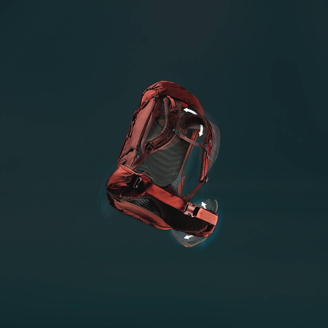 特許取得済みのフリー・フロート A3ダイナミックサスペンションを搭載し、ヒップベルト、ショルダーハーネス、そしてバックパネル下部が体に合わせて柔軟にフィットします。これは、オートフィット機能付きショルダーハーネス、フリー・フロート A3回転式ヒップベルトシステムによるもので、自然な歩行動作に合わせて伸縮し、比類のない快適性を実現します。