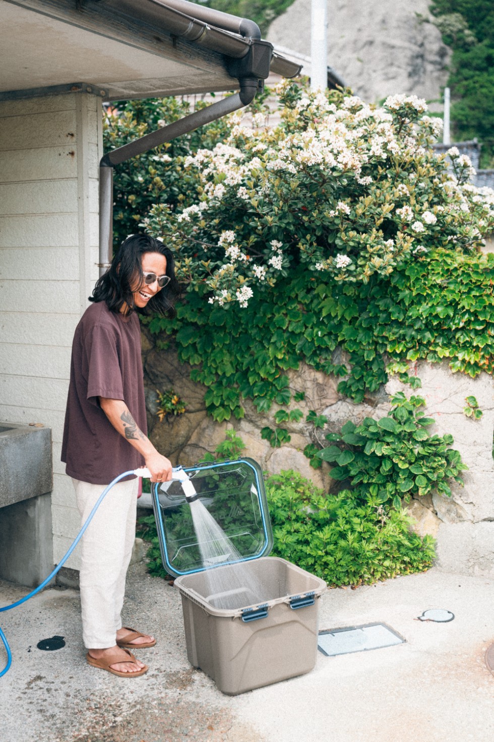 SUPはもちろん、シーカヤックやサーフィンなどさまざまなマリンアクティビティで真価を発揮するのが、防水性・防塵性を備える「アルパカギアボックス」だ。ウェットスーツや水着など濡れたものをさっとしまえ、このままクルマの荷室に収納できるという優れもの。ヒンジとラッチを組み合わせた蓋は取り外し可能で、どちらの側からも開閉することができる。興梠さんはシャワー後、ボックスの中で着替えを行っていたが、これなら砂まみれにならず、海水浴後の移動が快適になりそう。