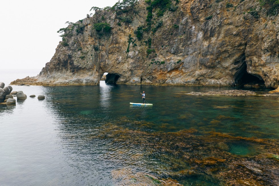 JAWSによるシーカヤックツアーやスタンドアップパドル(SUP)ツアーが開催されているので、道具がなくても気軽にマリンアクティビティを体験できるのもうれしい。興梠さんとSUPで目指したのは、湾内からアクセスできる2つの岩屋で、沖側の岩屋を新平洞屋、浜側を山門洞という。この岩屋には体色が9色に変化するクシキという名の龍が棲んでいたという伝説があり、なるほど、いまにも龍が飛び出てきそうな峻厳なムードを漂わせている。そうそう、佐渡は豊かな民話の伝承地としても知られるが、この集落の“達者”は安寿と厨子王の民話に由来する。厨子王と生き別れになった母がここで再会し、お互いの「達者」を喜び合ったとか。
