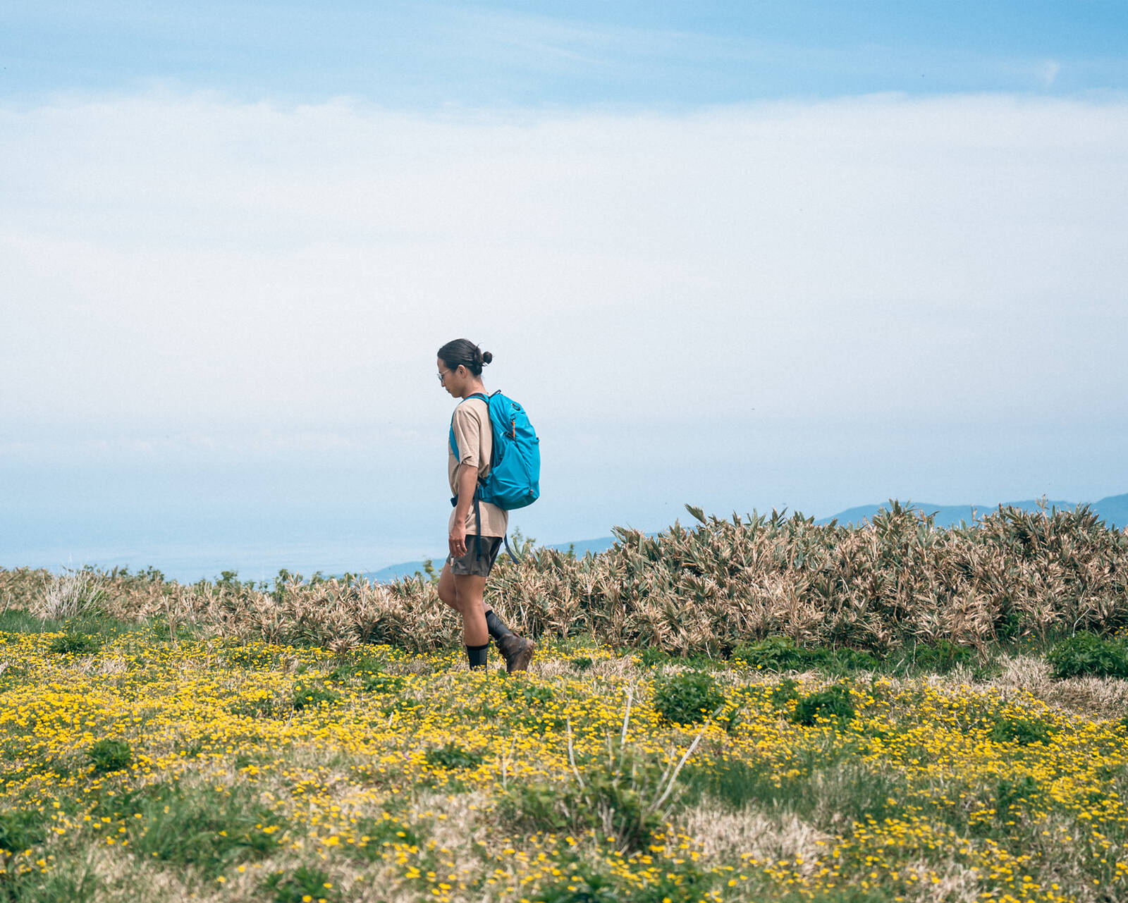 翌朝は日の出とともに目が覚めた。2日目は佐渡島の北半部にある、1,000m級の山々が連なる大佐渡山地のトレッキングへ。「キロ24」に水と行動食、レインウェアなどハイキング用の装備を詰めてドンデン高原へ出発する。