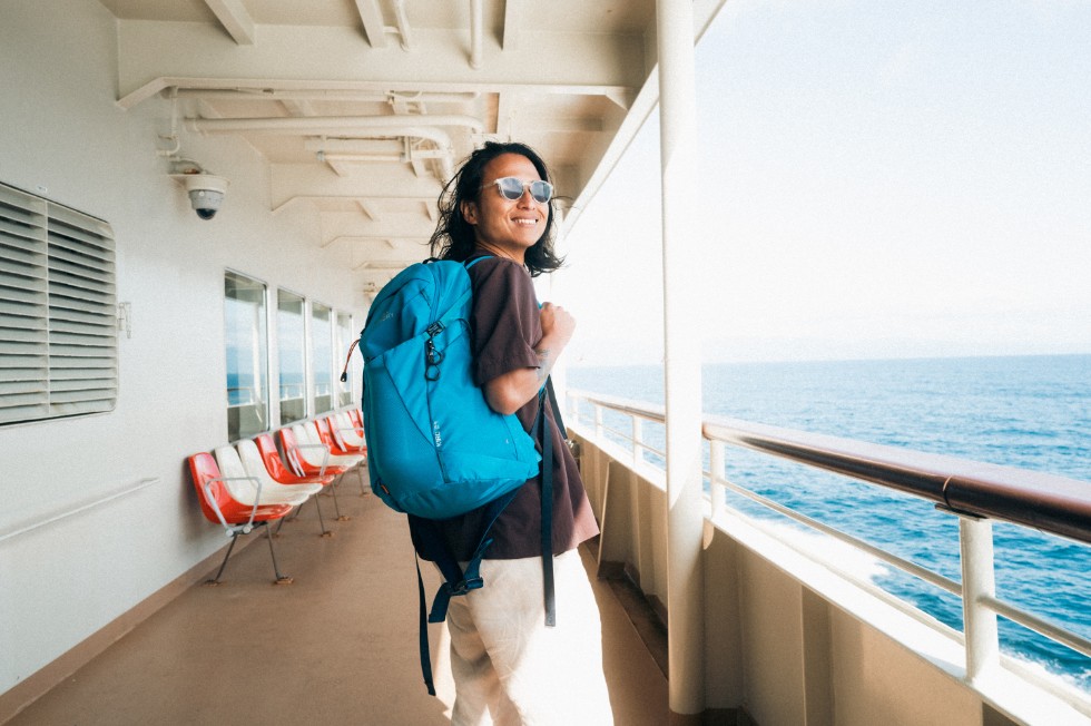 Sadoを拠点に、佐渡島北西部エリアの自然美を満喫するルートをナビゲートする。お気に入りのバックパック「キロ24」に着替えと身の回りのものをパッキングして、いざ新潟港へ!